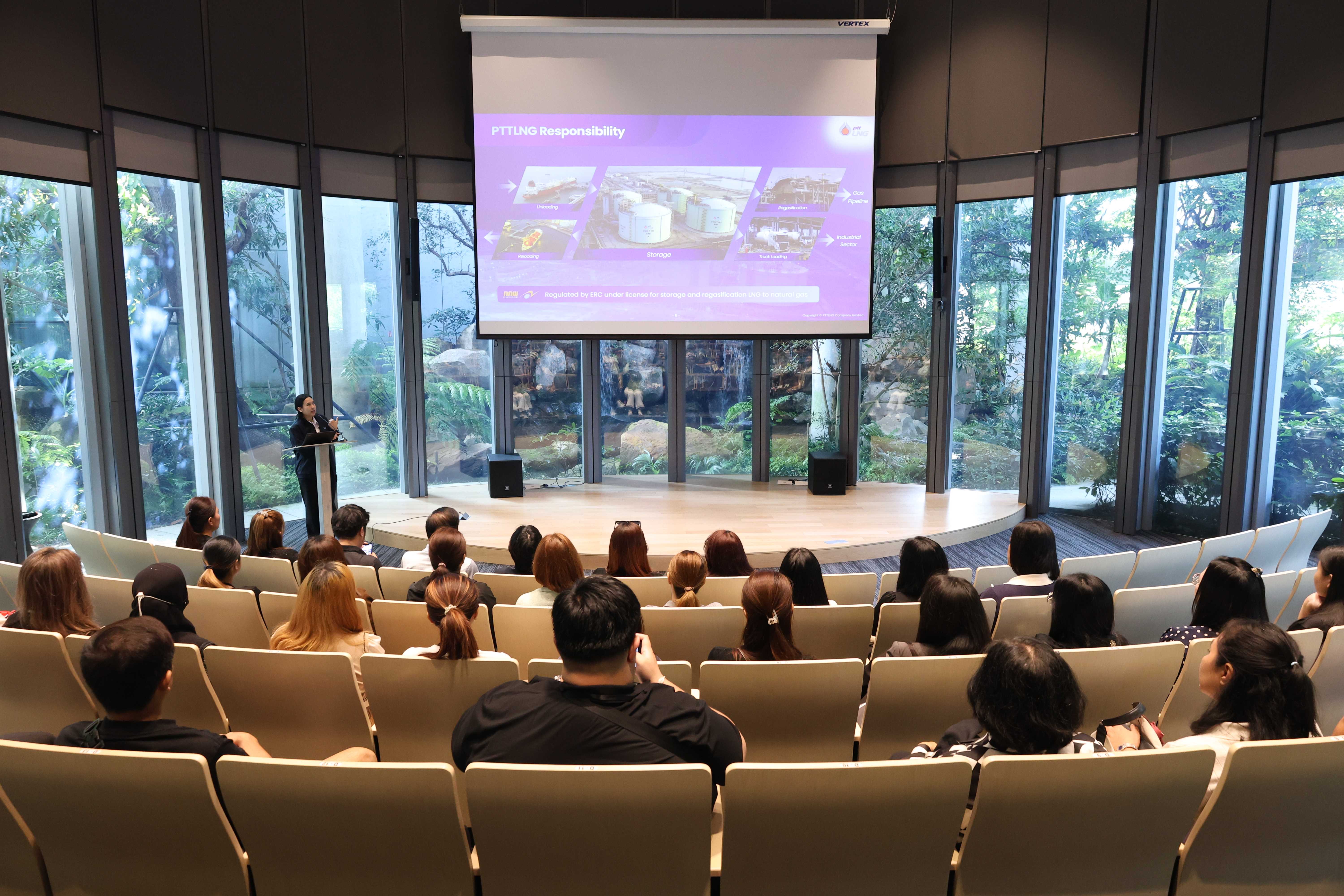 วันที่ 5 มีนาคม พ.ศ. 2569 บริษัท พีทีที แอลเอ็นจี จำกัด (PTTLNG) ให้การต้อนรับคณะบัณฑิตวิทยาลัย มหาวิทยาลัยศรีนครินทรวิโรฒ ในโอกาสเยี่ยมชม PTTLNG เพื่อศึกษาดูงานการดำเนินธุรกิจของ PTTLNG และให้เกิดความรู้ ความเข้าใจ ด้านการบริหารจัดการงานรับ-จ่ายก๊าซธรรมชาติเหลว ที่มาและการดำเนินด้านนวัตกรรมการนำพลังงานความเย็นจาก LNG ที่เหลือใช้มาพัฒนาให้เกิดประโยชน์สูงสุด รวมถึงการดำเนินงานตามภารกิจ โดยคำนึงถึงการมีส่วนรับผิดชอบต่อชุมชนและสังคมอย่างยั่งยืน โดยคณะฯได้รับฟังการบรรยายสรุป “ภาพรวมการดำเนินธุรกิจ PTTLNG” โดย คุณวรัญญู วรธงไชย พนักงานประชาสัมพันธ์ หลังจากนั้น คณะฯได้เข้าเยี่ยมชมพรรณไม้เมืองหนาวภายในอาคารนิทรรศน์พรรณพฤกษา ซึ่งใช้พลังงานความเย็นที่เหลือจากกระบวนการแปรสภาพก๊าซธรรมชาติเหลว (LNG) ในการควบคุมอุณหภูมิที่ 15 องศาเซลเซียส ถือเป็นหนึ่งในตัวอย่างนวัตกรรมการใช้พลังงานอย่างมีประสิทธิภาพและยั่งยืน