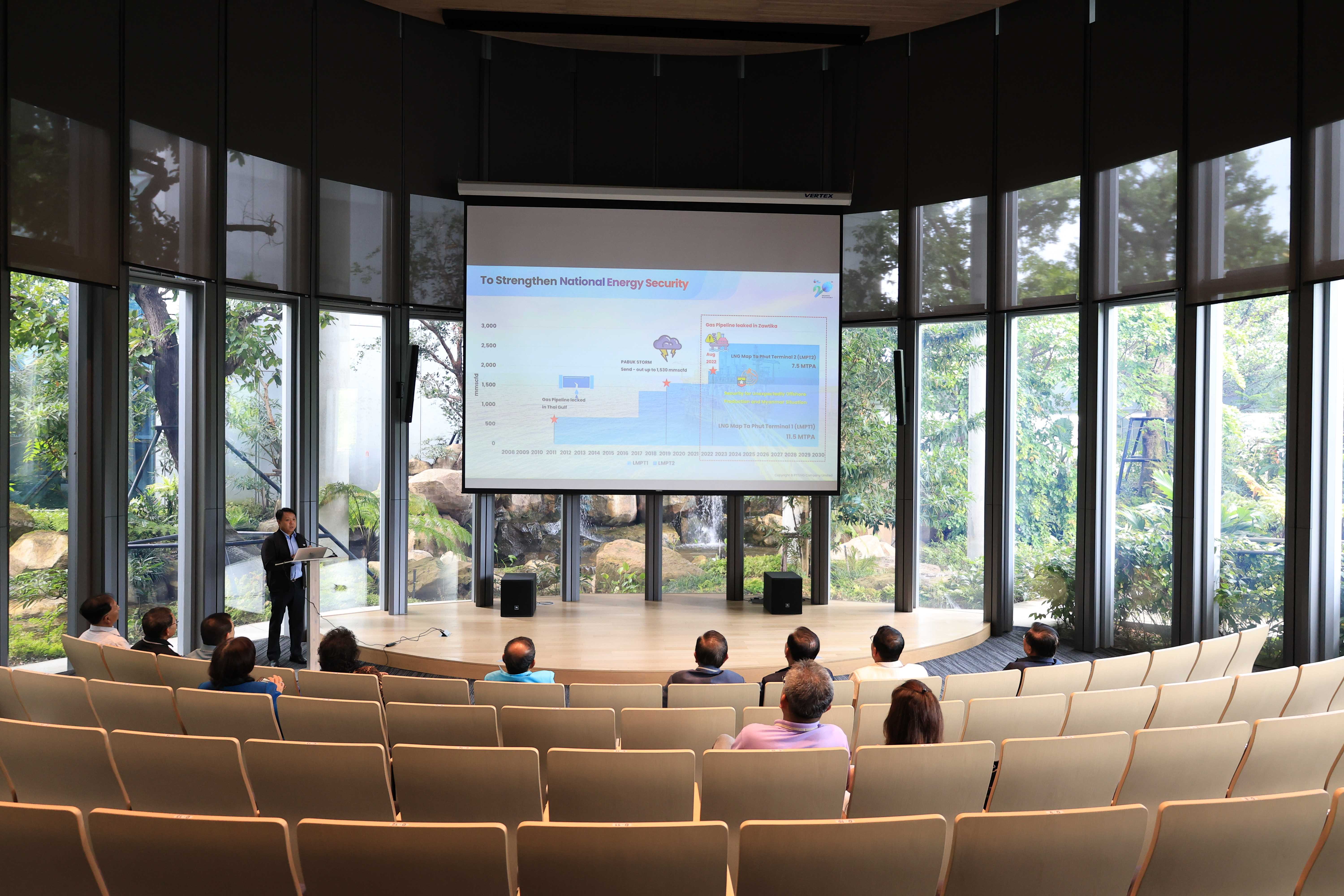 คณะกรรมาธิการการท่องเที่ยว วุฒิสภา เยี่ยมชม PTTLNG วันที่ 11 มิถุนายน 2567 เวลา 13.15 น. คุณวารินทร์ เอี่ยมธีระไพบูลย์ รองกรรมการผู้จัดการใหญ่ปฏิบัติการ สถานีแอลเอ็นจี มาบตาพุด แห่งที่ 2 ให้การต้อนรับคณะกรรมาธิการการท่องเที่ยว วุฒิสภา จำนวน 21 คน ในโอกาสศึกษาดูงานอาคารนิทรรศน์พรรณพฤกษา โดยคุณนรา โตแย้ม ผู้จัดการส่วนสื่อสารองค์กรและกิจการเพื่อสังคม ได้บรรยายสรุป "ภาพรวมการดำเนินธุรกิจ PTTLNG และการใช้ประโยชน์จากพลังงานความเย็น LNG" ณ ห้องออดิทอเรียม สถานีแอลเอ็นจี มาบตาพุด แห่งที่ 2 หลังจากนั้นได้เข้าเยี่ยมชมศูนย์ควบคุม การปฏิบัติการส่วนกลาง (Central Control Room) พร้อมทั้งเยี่ยมชมไม้เมืองหนาว ภายใน Climatic Dome อาคารนิทรรศน์พรรณพฤกษา ที่นำพลังงานความเย็น ก๊าซธรรมชาติเหลว (LNG) มาใช้ประโยชน์กับระบบปรับอากาศภายในอาคาร