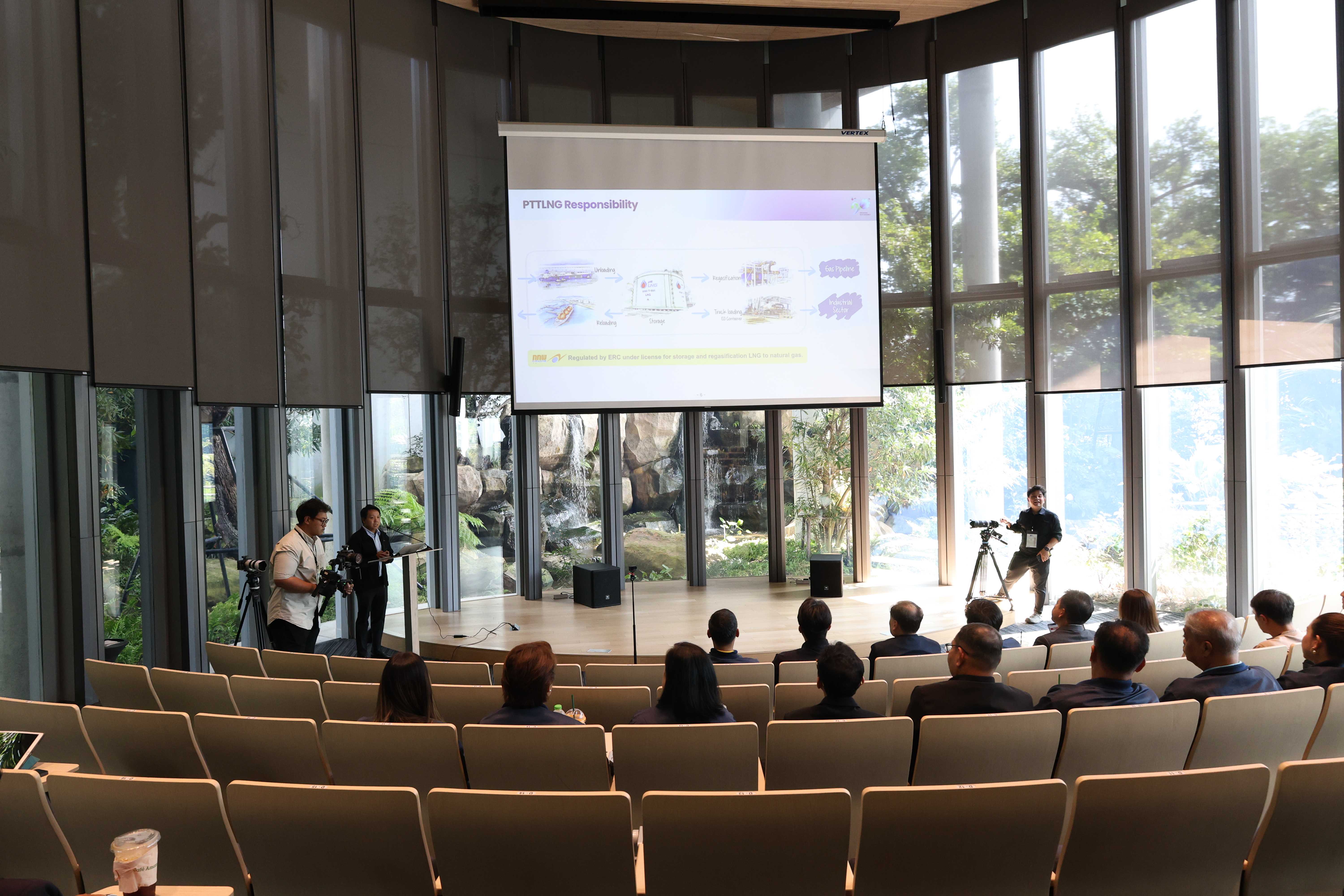 วันที่ 18 พฤศจิกายน 2567 เวลา 13.30 น. คุณระวิวัฒน์ เถลิงโชค รองกรรมการผู้จัดการใหญ่แผนกลยุทธ์และการเงิน PTTLNG, คุณอมรเทพ เสาวนิติกุล ผู้จัดการส่วนพาณิชยกิจและลูกค้าสัมพันธ์ และคุณนรา โตแย้ม ผู้จัดการส่วนสื่อสารองค์กรและกิจการเพื่อสังคม ให้การต้อนรับคณะกรรมาธิการกิจการศาล องค์กรอิสระ องค์กรอัยการ รัฐวิสาหกิจ องค์กรมหาชน และกองทุน สภาผู้แทนราษฎร จำนวน 20 คน ในโอกาสเยี่ยมชม PTTLNG เพื่อศึกษาดูงานการดำเนินด้านนวัตกรรมการนำพลังงงานความเย็นจาก LNG ที่เหลือใช้ มาพัฒนาให้เกิดประโยชน์สูงสุด โดยคณะฯ ได้รับฟังการบรรยายสรุป “ภาพรวมการดำเนินธุรกิจ PTTLNG” โดย คุณนรา โตแย้ม ผู้จัดการส่วนสื่อสารองค์กรและกิจการเพื่อสังคม ณ ห้องออดิทอเรียม สถานีแอลเอ็นจี มาบตาพุด แห่งที่ 2  หลังจากนั้นเข้าเยี่ยมชมศูนย์ควบคุมการปฏิบัติการส่วนกลาง (Central Control Room) ตลอดจนเยี่ยมชมไม้เมืองหนาวภายใน Climatic Dome อาคารนิทรรศน์พรรณพฤกษา ที่นำพลังงานความเย็นจากก๊าซธรรมชาติเหลว (LNG) มาใช้ประโยชน์กับระบบปรับอากาศภายในอาคาร