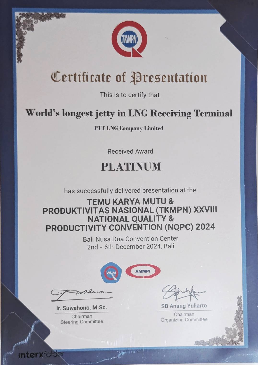 วันที่ 4 ธันวาคม 2567 บริษัท พีทีที แอลเอ็นจี จำกัด (PTTLNG) สร้างความภาคภูมิใจให้กับประเทศไทย หลังได้รับรางวัล "PLATINUM AWARD" จากการประชุมวิชาการคุณภาพนานาชาติ National Quality & Productivity Convention (NQPC) 2024 ณ เมืองเดนปาซ่าร์ ประเทศอินโดนีเซีย