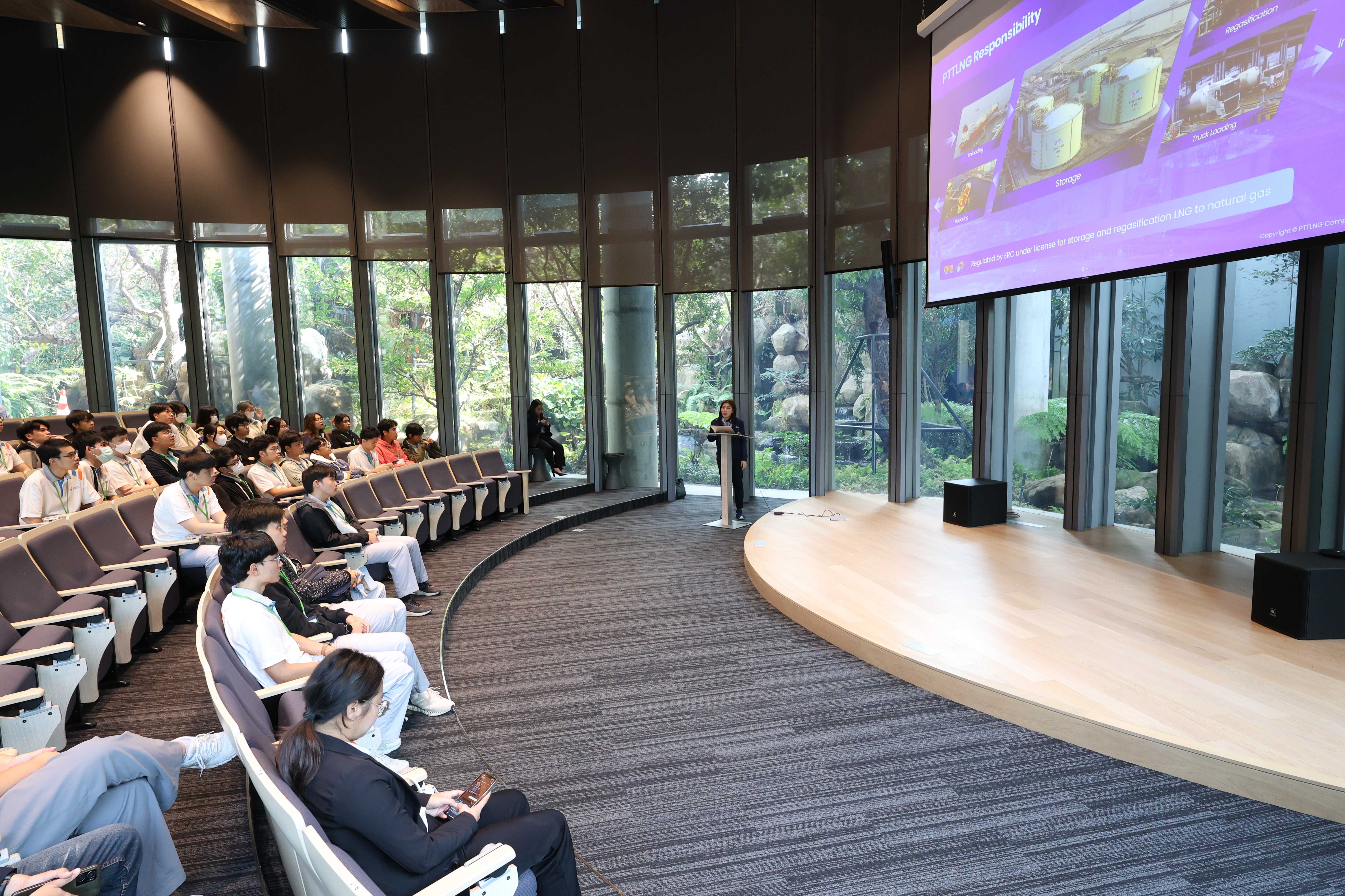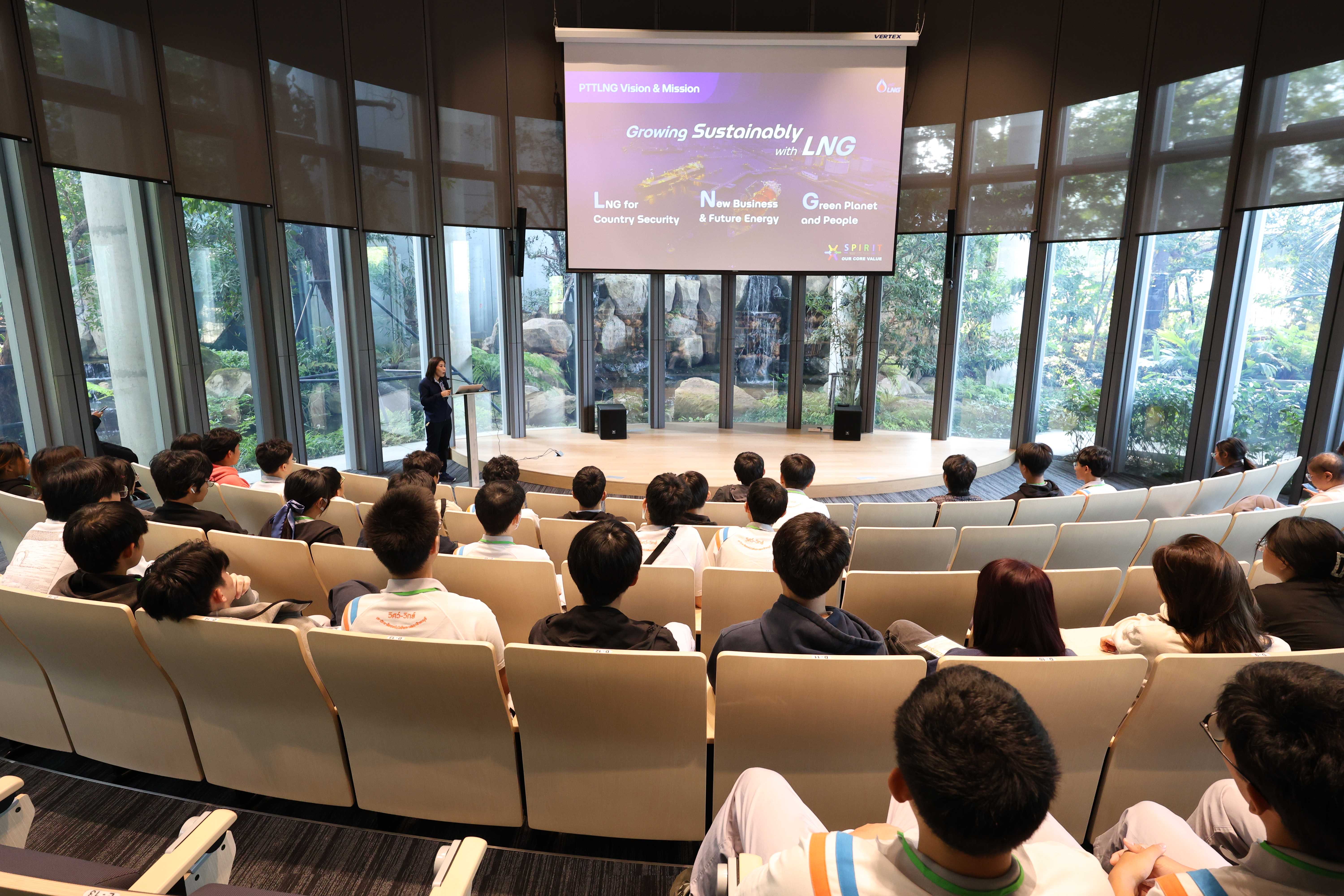 วันที่ 31 มกราคม 2568 เวลา 09.30 น. PTTLNG ให้การต้อนรับคณะสถาบัน KOSEN มหาวิทยาลัยเทคโนโลยีพระจอมเกล้าธนบุรี จำนวน 53 คน เนื่องในโอกาสเยี่ยมชม PTTLNG เพื่อศึกษาดูงานการดำเนินด้านนวัตกรรมการนำพลังงานความเย็นจาก LNG ที่เหลือใช้ มาพัฒนาให้เกิดประโยชน์สูงสุด และให้นักเรียนผู้มีความสามารถพิเศษด้านวิศวกรรมศาสตร์ และคณิตศาสตร์ ในหลักสูตรวิศวกรรมอัตโนมัติมีความใกล้ชิดกับภาคอุตสาหกรรม ตามเป้าหมายการพัฒนาอุตสาหกรรมใหม่ (New S-Curve) ของประเทศ โดยคณะฯ ได้รับฟังการบรรยายสรุป “ภาพรวมการดำเนินธุรกิจ PTTLNG” โดย คุณชมพูนุช ไวศยะพันธ์ ผู้จัดการส่วนบริหารและปฏิบัติการท่าเรือ LMPT2 ณ ห้องออดิทอเรียม สถานีแอลเอ็นจี มาบตาพุด แห่งที่ 2 หลังจากนั้นเข้าเยี่ยมชมศูนย์ควบคุมการปฏิบัติการส่วนกลาง (Central Control Room) ตลอดจนไม้เมืองหนาวภายใน Climatic Dome อาคารนิทรรศน์พรรณพฤกษา ที่นำพลังงานความเย็นจากก๊าซธรรมชาติเหลว (LNG) มาใช้ประโยชน์กับระบบปรับอากาศภายในอาคาร