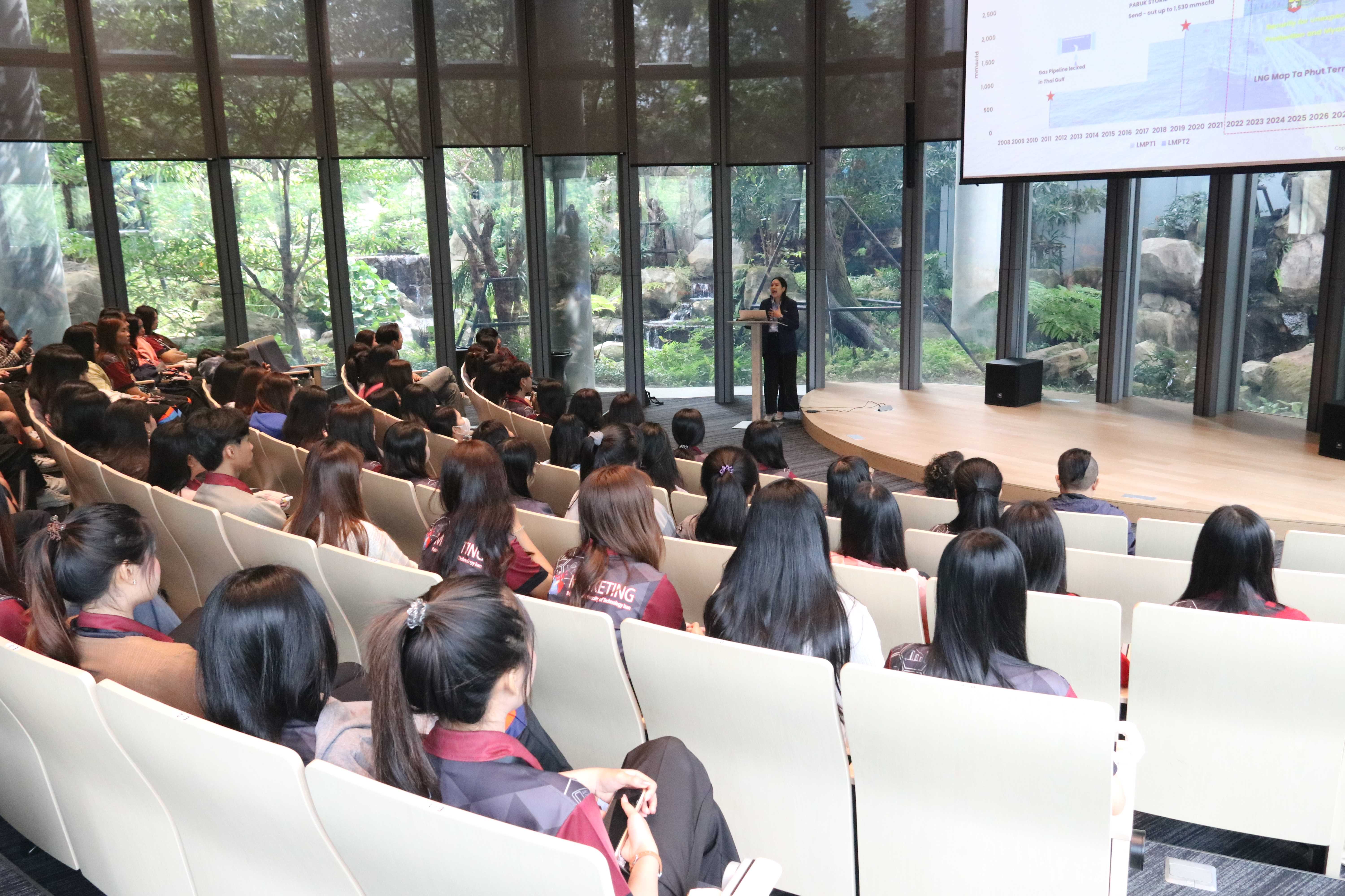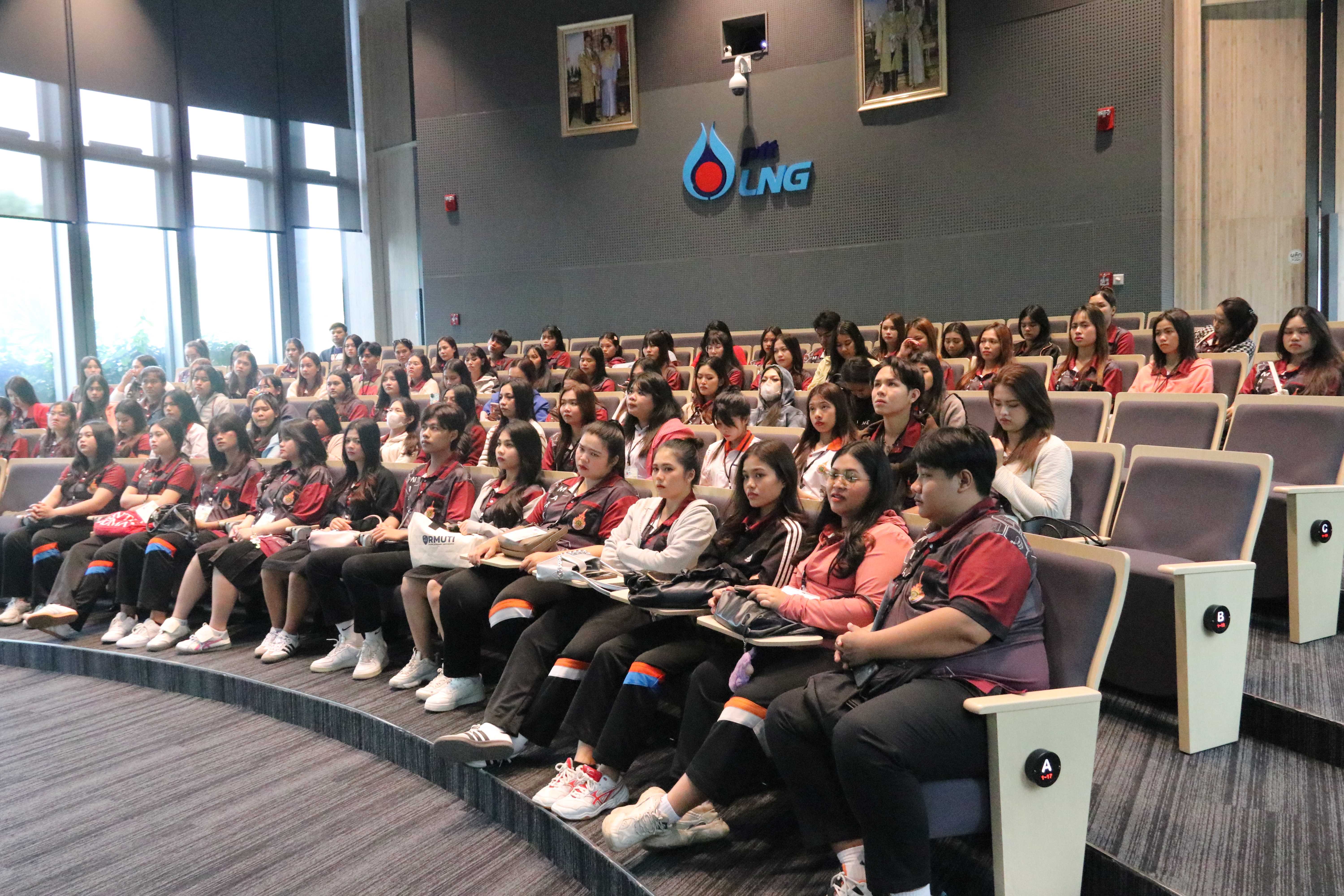 วันที่ 25 กุมภาพันธ์ พ.ศ. 2568 เวลา 09.00 น. PTTLNG ให้การต้อนรับคณาจารย์ และนักศึกษาคณะบริหารธุรกิจ สาขาการตลาด มหาวิทยาลัยเทคโนโลยีราชมงคลอีสาน จำนวน 83 คนเนื่องในโอกาสเยี่ยมชม PTTLNG เพื่อศึกษาดูงานการดำเนินธุรกิจของ PTTLNG รวมถึงระบบการบริหารจัดการด้านการตลาดของบริษัทฯ และระบบการจัดการพลังงานควบคู่กับการอนุรักษ์สิ่งแวดล้อมได้อย่างยั่งยืน โดยคณะฯได้รับฟังการบรรยายสรุป “ภาพรวมการดำเนินธุรกิจ PTTLNG” โดยคุณวรัญญู วรธงไชย พนักงานประชาสัมพันธ์ ณ ห้องออดิทอเรียม สถานีแอลเอ็นจี มาบตาพุด แห่งที่ 2 หลังจากนั้นเข้าเยี่ยมชมไม้เมืองหนาวภายใน Climatic Dome อาคารนิทรรศน์พรรณพฤกษา ที่นำพลังงานความเย็นจากก๊าซธรรมชาติเหลว (LNG) มาใช้ประโยชน์กับระบบปรับอากาศภายในอาคาร