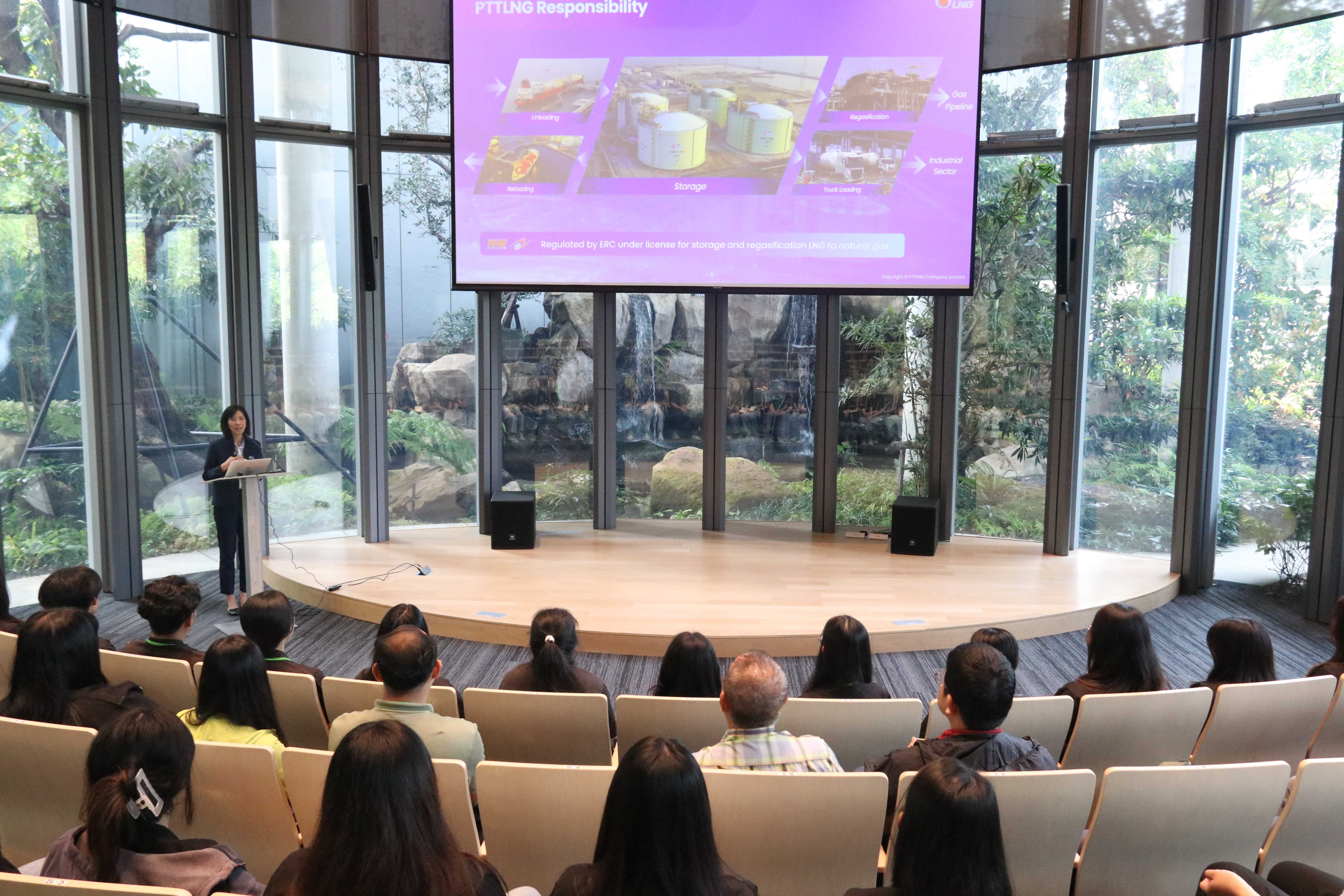 วันที่ 28 กุมภาพันธ์ พ.ศ. 2568 เวลา 09.30 น. PTTLNG ให้การต้อนรับต้อนรับคณาจารย์ และนักศึกษาคณะวิศวกรรมศาสตร์ มหาวิทยาลัยอุบลราชธานี จำนวน 45 คน เนื่องในโอกาสเยี่ยมชม PTTLNG เพื่อศึกษาดูงานการดำเนินธุรกิจของ PTTLNG รวมถึงการดำเนินด้านนวัตกรรมการนำพลังงานความเย็นจาก LNG ที่เหลือใช้มาพัฒนาให้เกิดประโยชน์สูงสุด รวมถึงระบบการจัดการพลังงานควบคู่กับการอนุรักษ์สิ่งแวดล้อมได้อย่างยั่งยืน โดยคณะฯได้รับฟังการบรรยายสรุป “ภาพรวมการดำเนินธุรกิจ PTTLNG” โดยคุณจุฑารัตน์ พิทักษ์วาทิน พนักงานประชาสัมพันธ์อาวุโส ณ ห้องออดิทอเรียม สถานีแอลเอ็นจี มาบตาพุด แห่งที่ 2 หลังจากนั้นเข้าเยี่ยมชมไม้เมืองหนาวภายใน Climatic Dome อาคารนิทรรศน์พรรณพฤกษา ที่นำพลังงานความเย็นจากก๊าซธรรมชาติเหลว (LNG) มาใช้ประโยชน์กับระบบปรับอากาศภายในอาคาร