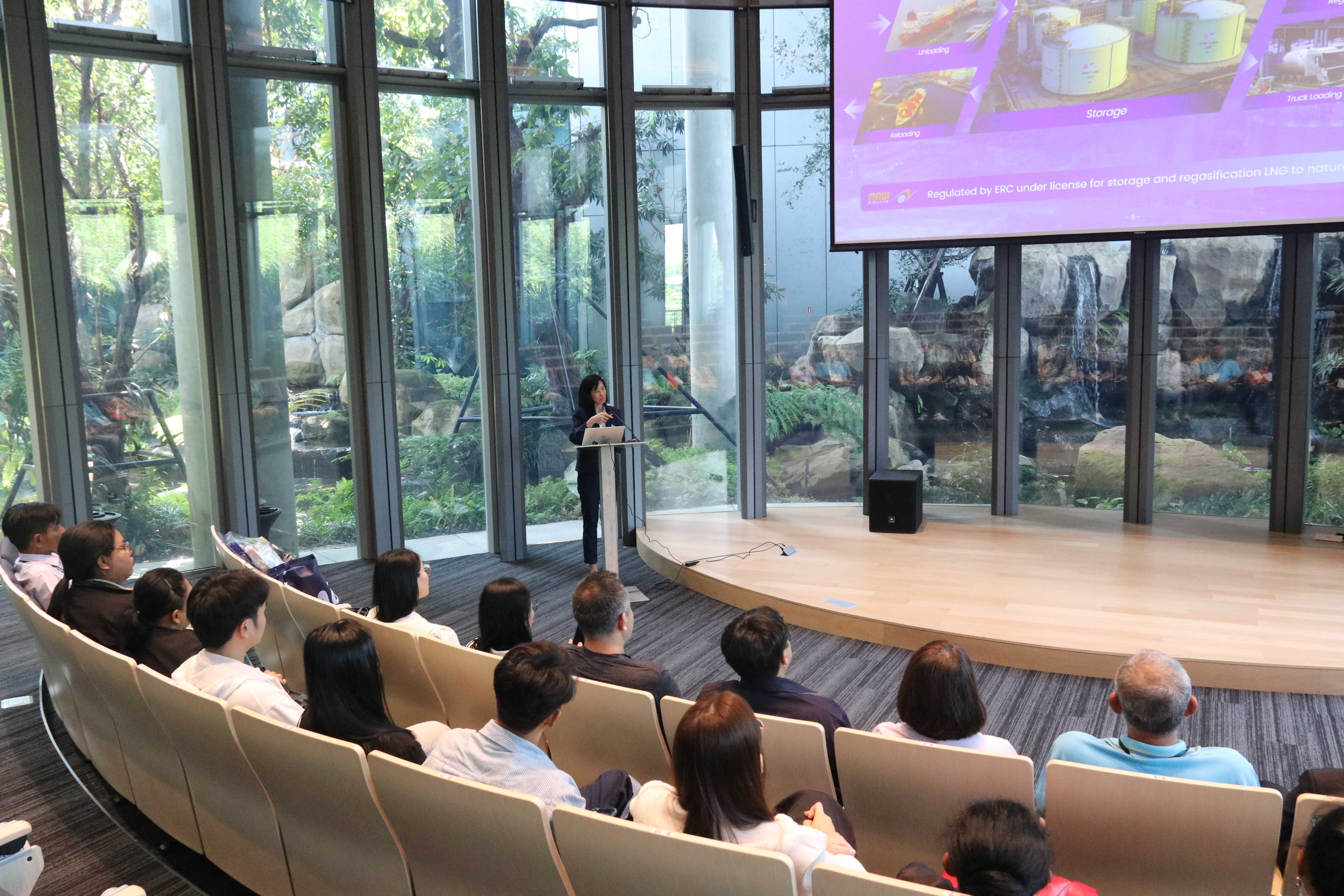 วันที่ 28 กุมภาพันธ์ พ.ศ. 2568 เวลา 10.00 น. PTTLNG ให้การต้อนรับต้อนรับต้อนรับคณะสำนักงานนิคมอุตสาหกรรมเวลโกรว์ (สน.วก.) จำนวน 30 คน เนื่องในโอกาสเยี่ยมชม PTTLNG เพื่อศึกษาดูงานการดำเนินธุรกิจของ PTTLNG และให้เกิดความรู้ ความเข้าใจ ที่มาและการดำเนินด้านนวัตกรรมการนำพลังงานความเย็นจาก LNG ที่เหลือใช้มาพัฒนาให้เกิดประโยชน์สูงสุด รวมถึงระบบการจัดการพลังงานควบคู่กับการอนุรักษ์สิ่งแวดล้อมได้อย่างยั่งยืน โดยคณะฯได้รับฟังการบรรยายสรุป “ภาพรวมการดำเนินธุรกิจ PTTLNG” โดยคุณจุฑารัตน์ พิทักษ์วาทิน พนักงานประชาสัมพันธ์อาวุโส ณ ห้องออดิทอเรียม สถานีแอลเอ็นจี มาบตาพุด แห่งที่ 2 หลังจากนั้นเข้าเยี่ยมชมไม้เมืองหนาวภายใน Climatic Dome อาคารนิทรรศน์พรรณพฤกษา ที่นำพลังงานความเย็นจากก๊าซธรรมชาติเหลว (LNG) มาใช้ประโยชน์กับระบบปรับอากาศภายในอาคาร