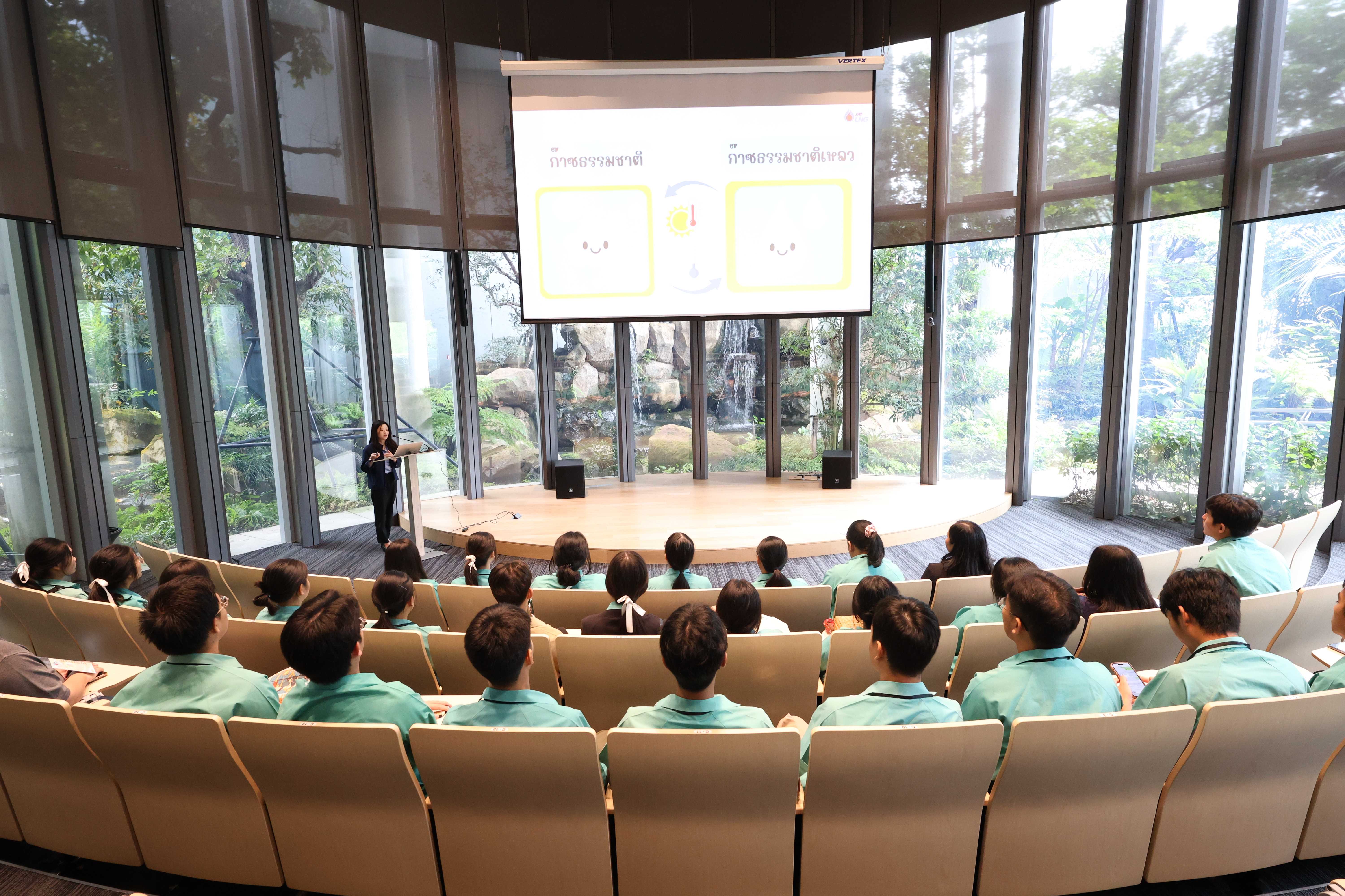 วันที่ 17 มีนาคม พ.ศ. 2568 PTTLNG ให้การต้อนรับคณาจารย์และนักเรียนชั้นมัธยมศึกษาปีที่ 6 โรงเรียนสตรีสมุทรปราการ เนื่องในโอกาสเยี่ยมชม PTTLNG เพื่อศึกษาที่มาของการดำเนินด้านนวัตกรรมการนำพลังงานความเย็นจาก LNG ที่เหลือใช้มาพัฒนาให้เกิดประโยชน์สูงสุด และระบบการจัดการพลังงานควบคู่กับการอนุรักษ์สิ่งแวดล้อมได้อย่างยั่งยืน โดยคณะฯได้รับฟังการบรรยายสรุป “ภาพรวมการดำเนินธุรกิจ PTTLNG” โดย คุณณัชริกาญจน์ พลานุเคราะห์ พนักงานประชาสัมพันธ์ หลังจากนั้นเข้าเยี่ยมชมไม้เมืองหนาวภายในอาคารนิทรรศน์พรรณพฤกษา ศูนย์เลิศพนานุรักษ์ ที่นำพลังงานความเย็นจากก๊าซธรรมชาติเหลว (LNG) มาใช้ประโยชน์กับระบบปรับอากาศภายในอาคาร