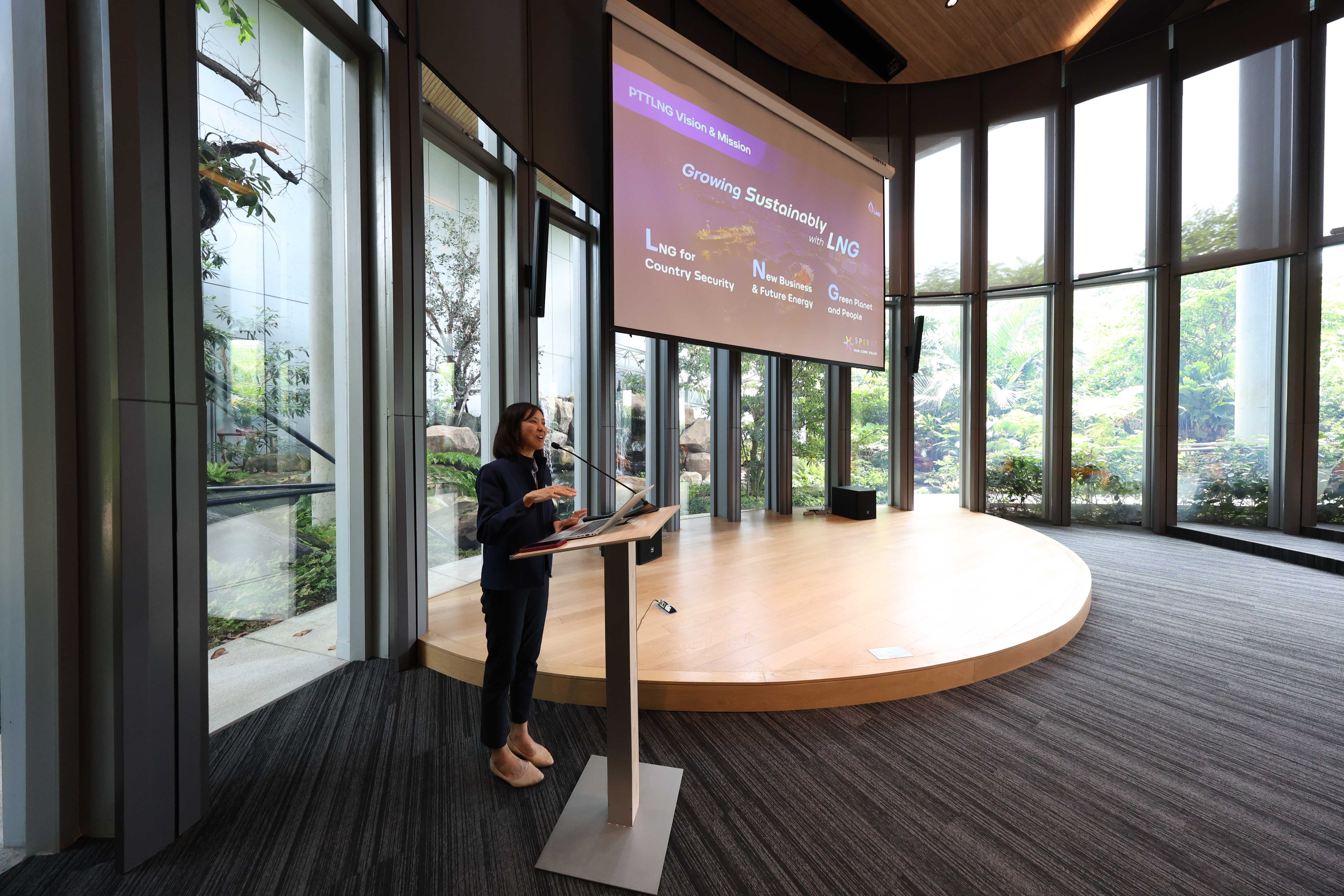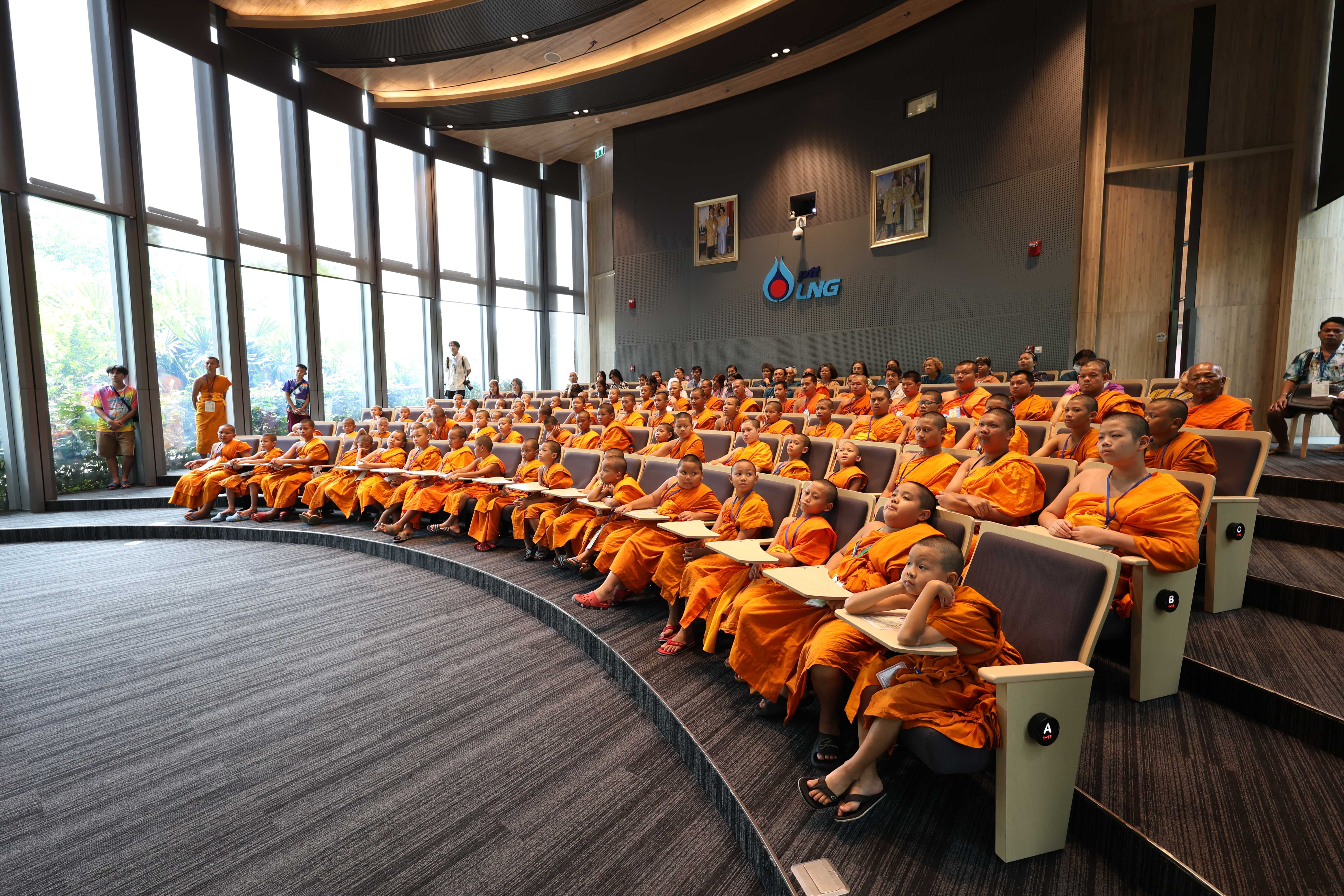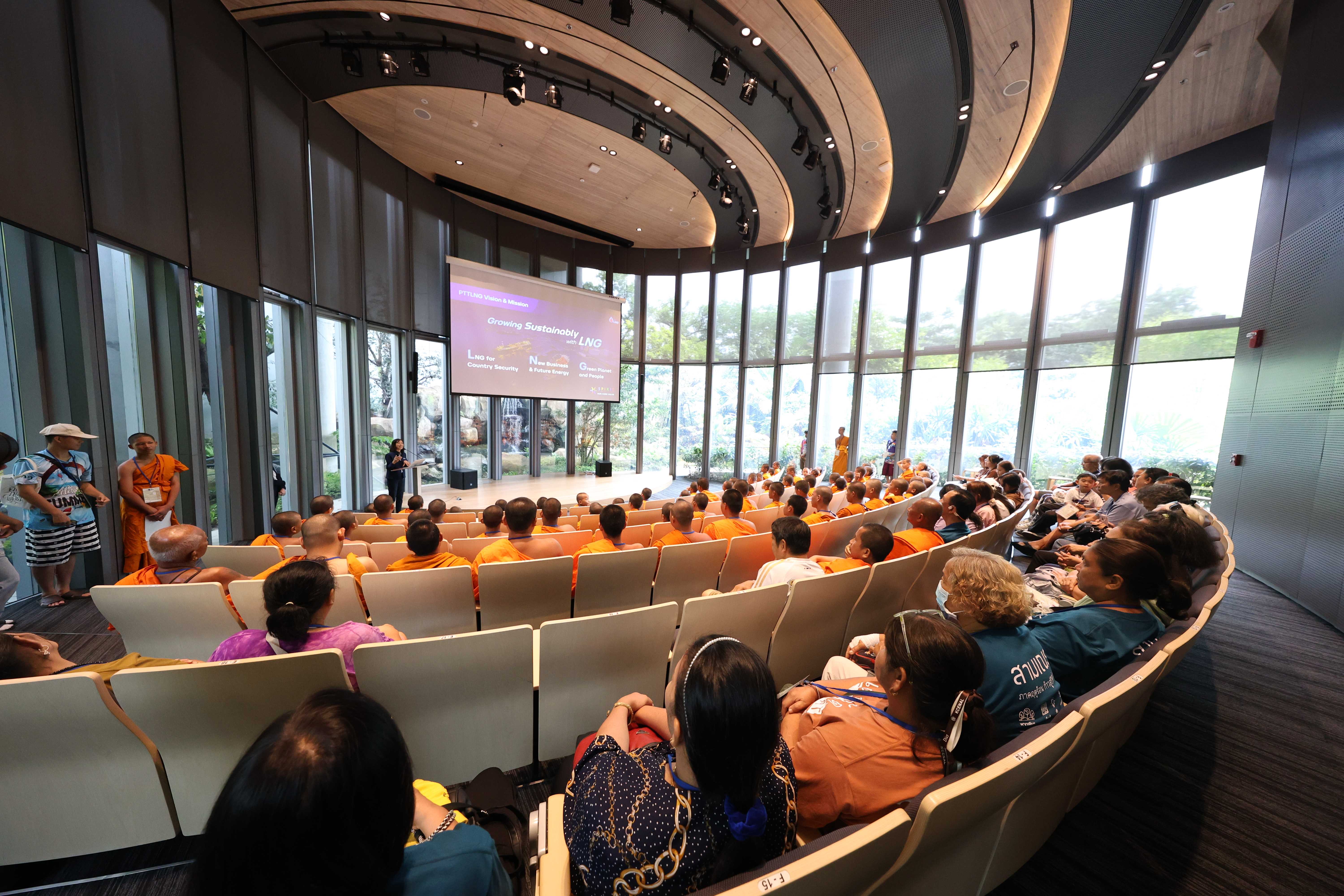 วันที่ 8 เมษายน พ.ศ. 2568 PTTLNG ให้การต้อนรับคณะพระสงฆ์ สามเณร และผู้ติดตามจากศูนย์ศึกษาพระพุทธศาสนาวันอาทิตย์วัดทางหลวง เนื่องในโอกาสเยี่ยมชม PTTLNG เพื่อศึกษาดูงานการดำเนินธุรกิจของ PTTLNG และให้เกิดความรู้ ความเข้าใจ ที่มาและการดำเนินด้านนวัตกรรมการนำพลังงานความเย็นจาก LNG ที่เหลือใช้มาพัฒนาให้เกิดประโยชน์สูงสุด รวมถึงการดำเนินงานตามภารกิจโดยคำนึงถึงการมีส่วนรับผิดชอบ ต่อชุมชนและสังคม และสิ่งแวดล้อมได้อย่างยั่งยืน โดยคณะฯได้รับฟังการบรรยายสรุป “ภาพรวมการดำเนินธุรกิจ PTTLNG” โดย คุณจุฑารัตน์ พิทักษ์วาทิน พนักงานประชาสัมพันธ์อาวุโส หลังจากนั้นเข้าเยี่ยมชมไม้เมืองหนาวภายในอาคารนิทรรศน์พรรณพฤกษา ศูนย์เลิศพนานุรักษ์ ที่นำพลังงานความเย็นจากก๊าซธรรมชาติเหลว (LNG) มาใช้ประโยชน์กับระบบปรับอากาศภายในอาคาร