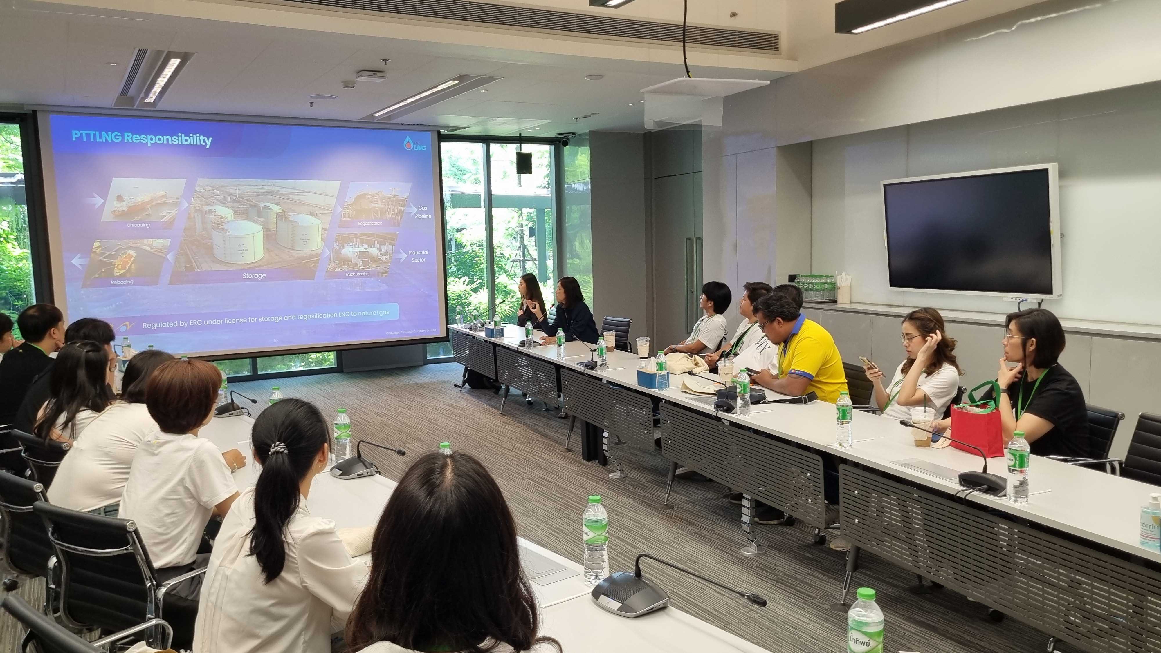 วันที่ 28 เมษายน พ.ศ. 2568 PTTLNG ให้การต้อนรับคณะบุคลากรของศูนย์การเรียนรู้ กฟผ. ผาบ่อง จังหวัดแม่ฮ่องสอน, ศูนย์การเรียนรู้ กฟผ. แม่ออน จังหวัดเชียงใหม่ และพิพิธภัณฑ์ศูนย์ถ่านหินลิกไนต์ศึกษา (เหมืองแม่เมาะ) เฉลิมพระเกียรติฯ จังหวัดลำปาง เนื่องในโอกาสเยี่ยมชม PTTLNG เพื่อศึกษาดูงานการดำเนินธุรกิจของ PTTLNG และให้เกิดความรู้ ความเข้าใจ ที่มาและการดำเนินด้านนวัตกรรมการนำพลังงานความเย็นจาก LNG ที่เหลือใช้มาพัฒนาให้เกิดประโยชน์สูงสุด รวมถึงระบบการจัดการพลังงานควบคู่กับการอนุรักษ์สิ่งแวดล้อมได้อย่างยั่งยืน โดยคณะฯได้รับฟังการบรรยายสรุป “ภาพรวมการดำเนินธุรกิจ PTTLNG” โดย คุณจุฑารัตน์ พิทักษ์วาทิน พนักงานประชาสัมพันธ์อาวุโส หลังจากนั้นคณะฯได้เข้าเยี่ยมชมไม้เมืองหนาวภายในอาคารนิทรรศน์พรรณพฤกษา ศูนย์เลิศพนานุรักษ์ ที่นำพลังงานความเย็นจากก๊าซธรรมชาติเหลว (LNG) มาใช้ประโยชน์กับระบบปรับอากาศภายในอาคาร