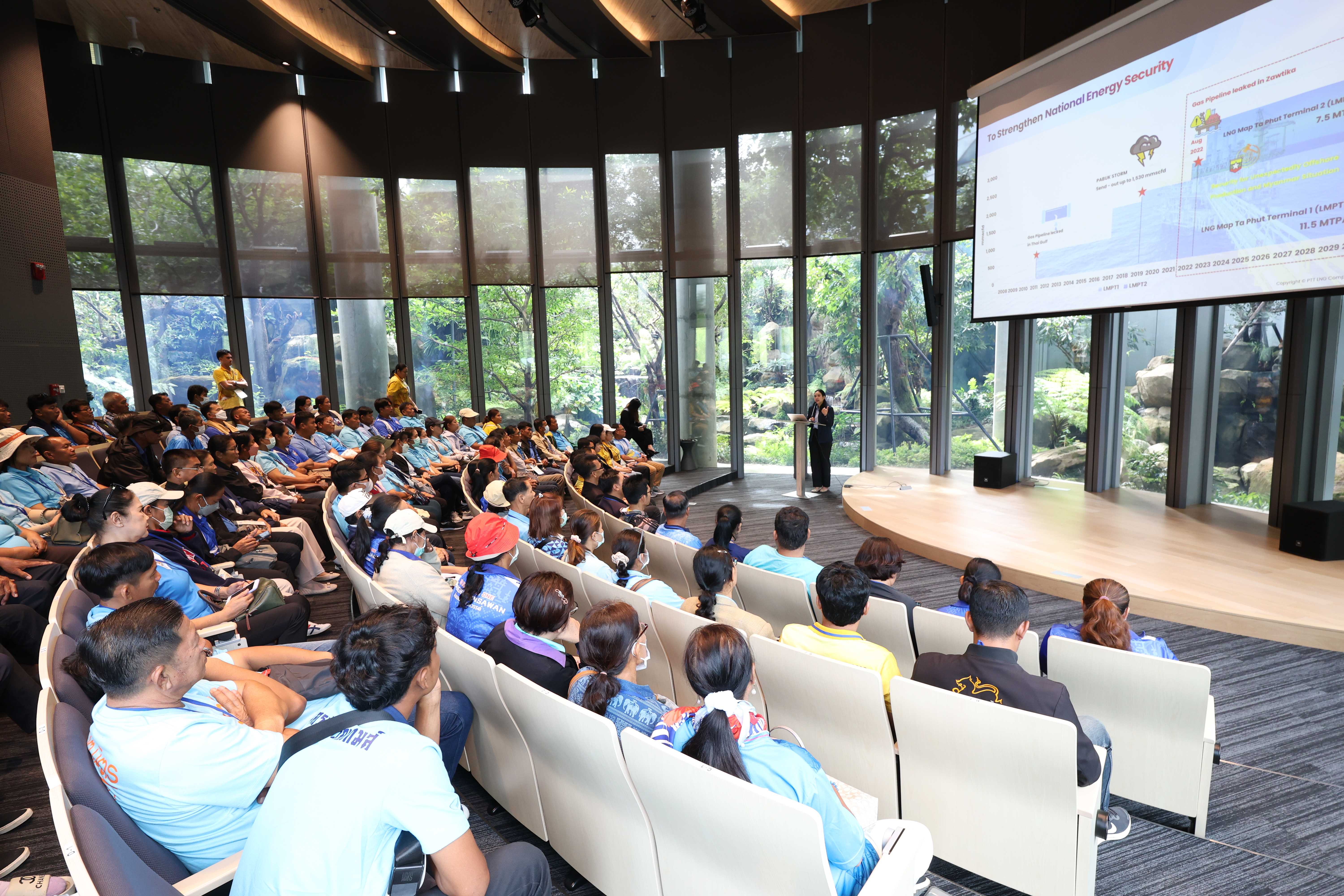 วันที่ 15 พฤษภาคม พ.ศ. 2568 PTTLNG ให้การต้อนรับคณะผู้บริหารท้องถิ่น ผู้นำชุมชน และสมาชิกสภาองค์การบริหารส่วนตำบลหนองกรด จังหวัดนครสวรรค์ เนื่องในโอกาสเยี่ยมชม PTTLNG เพื่อศึกษาดูงานให้เกิดความรู้ ความเข้าใจ ที่มาของการดำเนินธุรกิจของ PTTLNG และการดำเนินงานตามภารกิจ โดยคำนึงถึงการมีส่วนรับผิดชอบต่อชุมชนและสังคมอย่างยั่งยืน โดยคณะฯได้รับฟังการบรรยายสรุป “ภาพรวมการดำเนินธุรกิจ PTTLNG” โดย คุณวรัญญู วรธงไชย พนักงานประชาสัมพันธ์ หลังจากนั้นคณะฯได้เข้าเยี่ยมชมไม้เมืองหนาวภายในอาคารนิทรรศน์พรรณพฤกษา ศูนย์เลิศพนานุรักษ์ ที่นำพลังงานความเย็นจากก๊าซธรรมชาติเหลว (LNG) มาใช้ประโยชน์กับระบบปรับอากาศภายในอาคาร
