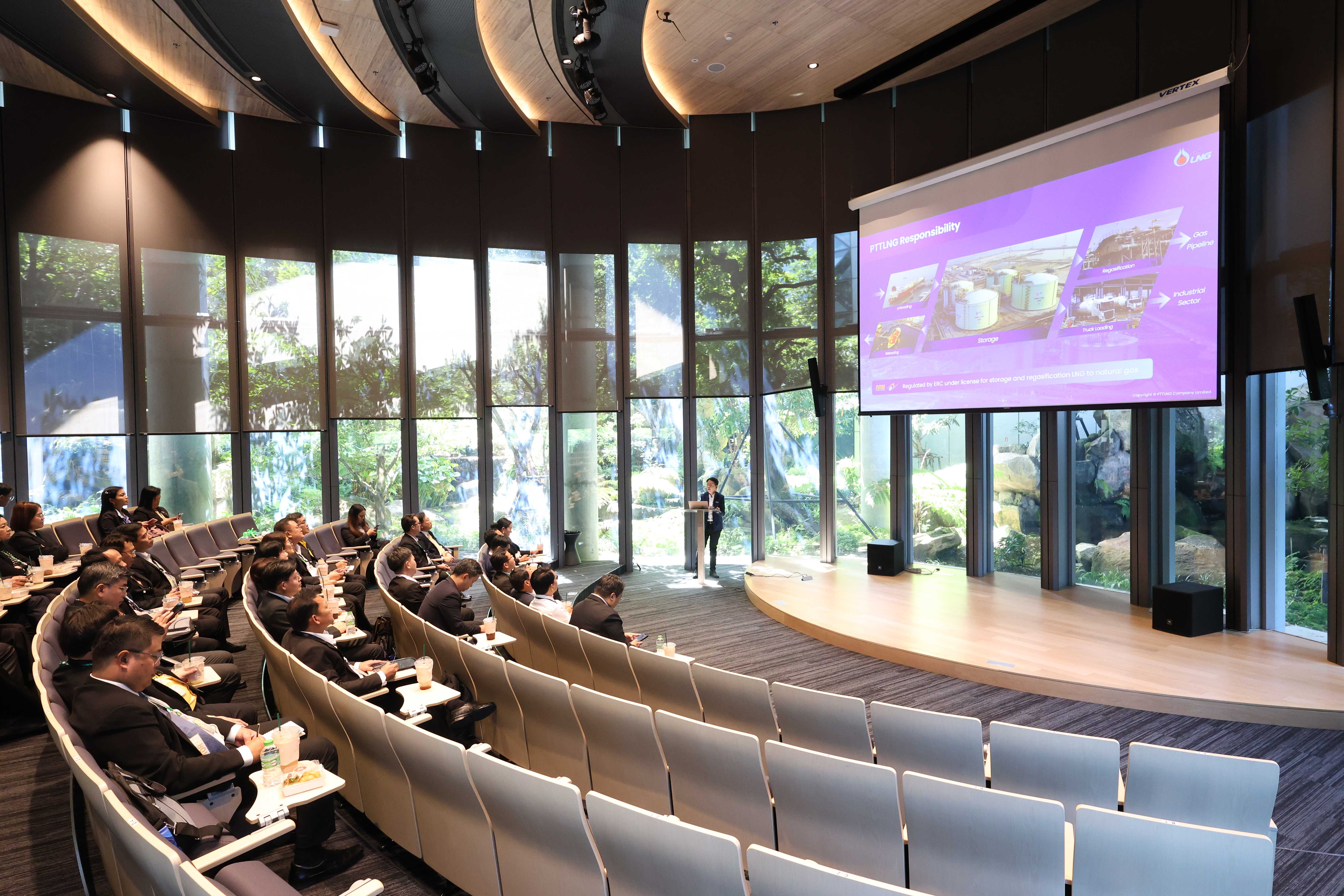 วันที่ 18 มิถุนายน พ.ศ. 2568  PTTLNG ให้การต้อนรับคณะผู้เข้ารับการศึกษาอบรม พร้อมด้วยอาจารย์และเจ้าหน้าที่หลักสูตรนักบริหารระดับสูง กระทรวงสาธารณสุข รุ่นที่ 6 ประจำปีงบประมาณ 2568 วิทยาลัยนักบริหารสาธารณสุข กระทรวงสาธารณสุข เนื่องในโอกาสเข้าเยี่ยมชม PTTLNG เพื่อศึกษาดูงานการดำเนินธุรกิจของ PTTLNG และให้เกิดความรู้ ความเข้าใจ ที่มาและการดำเนินด้านนวัตกรรมการนำพลังงานความเย็นจาก LNG ที่เหลือใช้มาพัฒนาให้เกิดประโยชน์สูงสุด รวมถึงระบบการจัดการพลังงานควบคู่กับการอนุรักษ์สิ่งแวดล้อมได้อย่างยั่งยืน โดยคณะได้รับฟังการบรรยายสรุป “ภาพรวมการดำเนินธุรกิจ PTTLNG” โดย คุณตฤณ เจตสุคนธร รักษาการผู้จัดการส่วนเทคโนโลยีและนวัตกรรม พร้อมกันนี้ คณะได้เข้าเยี่ยมชมเทคโนโลยีระบบปฏิบัติการที่ศูนย์ควบคุมการปฏิบัติการส่วนกลาง (Central Control Room) ตลอดจนเข้าเยี่ยมชมไม้เมืองหนาวภายในอาคารนิทรรศน์พรรณพฤกษา นับเป็นอาคารที่นำพลังงานความเย็นจากก๊าซธรรมชาติเหลว (LNG) มาใช้ในการจัดแสดงพรรณไม้เมืองหนาวที่อุณหภูมิ 15 องศาเซลเซียส