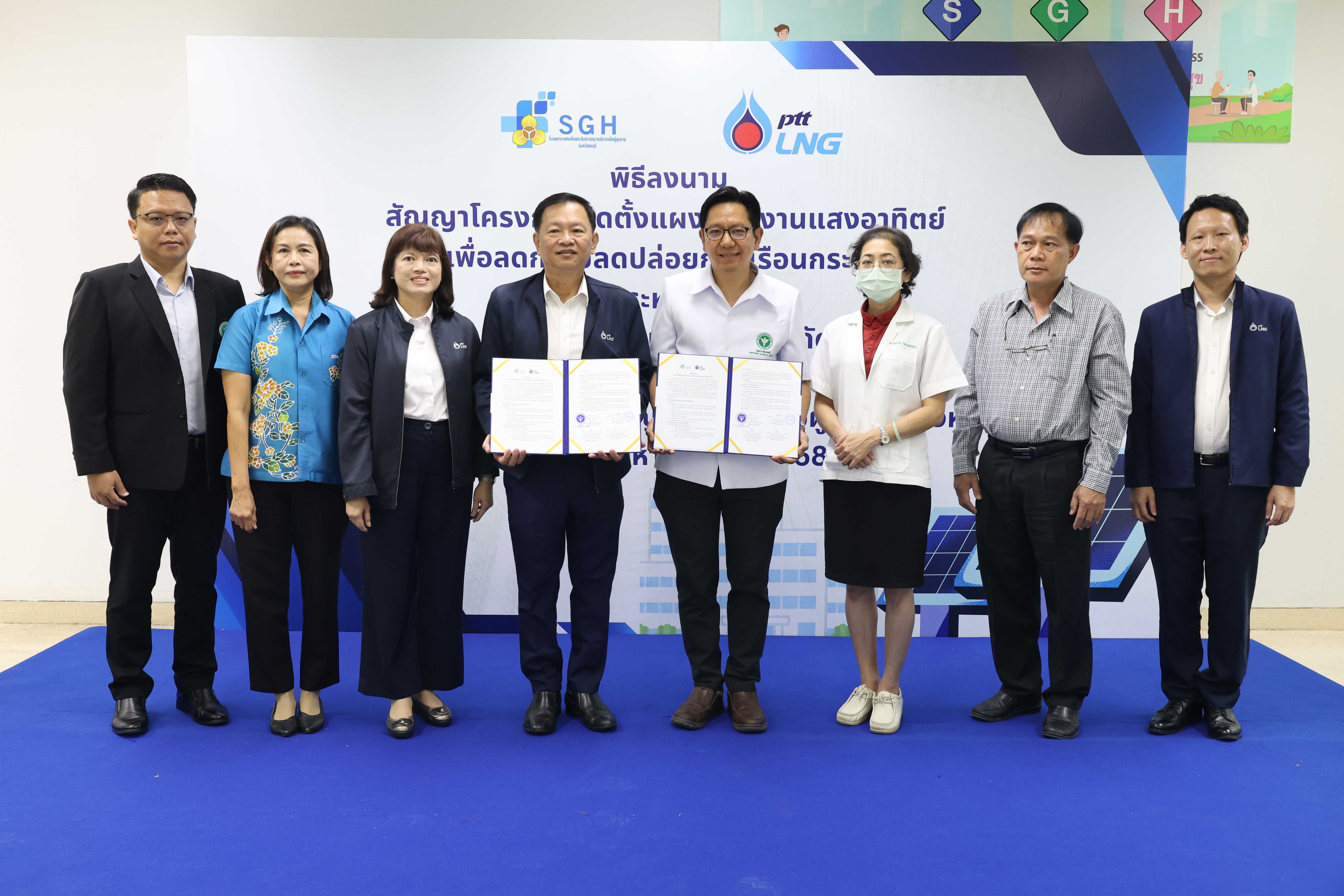 วันที่ 22 สิงหาคม 2568 บริษัท พีทีที แอลเอ็นจี จำกัด (PTTLNG) ลงนามบันทึกข้อตกลงความร่วมมือกับโรงพยาบาลสมเด็จพระสังฆราชญาณสังวร เพื่อผู้สูงอายุ จังหวัดชลบุรี สนับสนุนการติดตั้งระบบ Solar Rooftop ขนาด 40 กิโลวัตต์ คาดช่วยลดการปล่อยก๊าซเรือนกระจกกว่า 23.7 ตันคาร์บอนไดออกไซด์ต่อปี และลดค่าใช้จ่ายพลังงานในระยะยาว