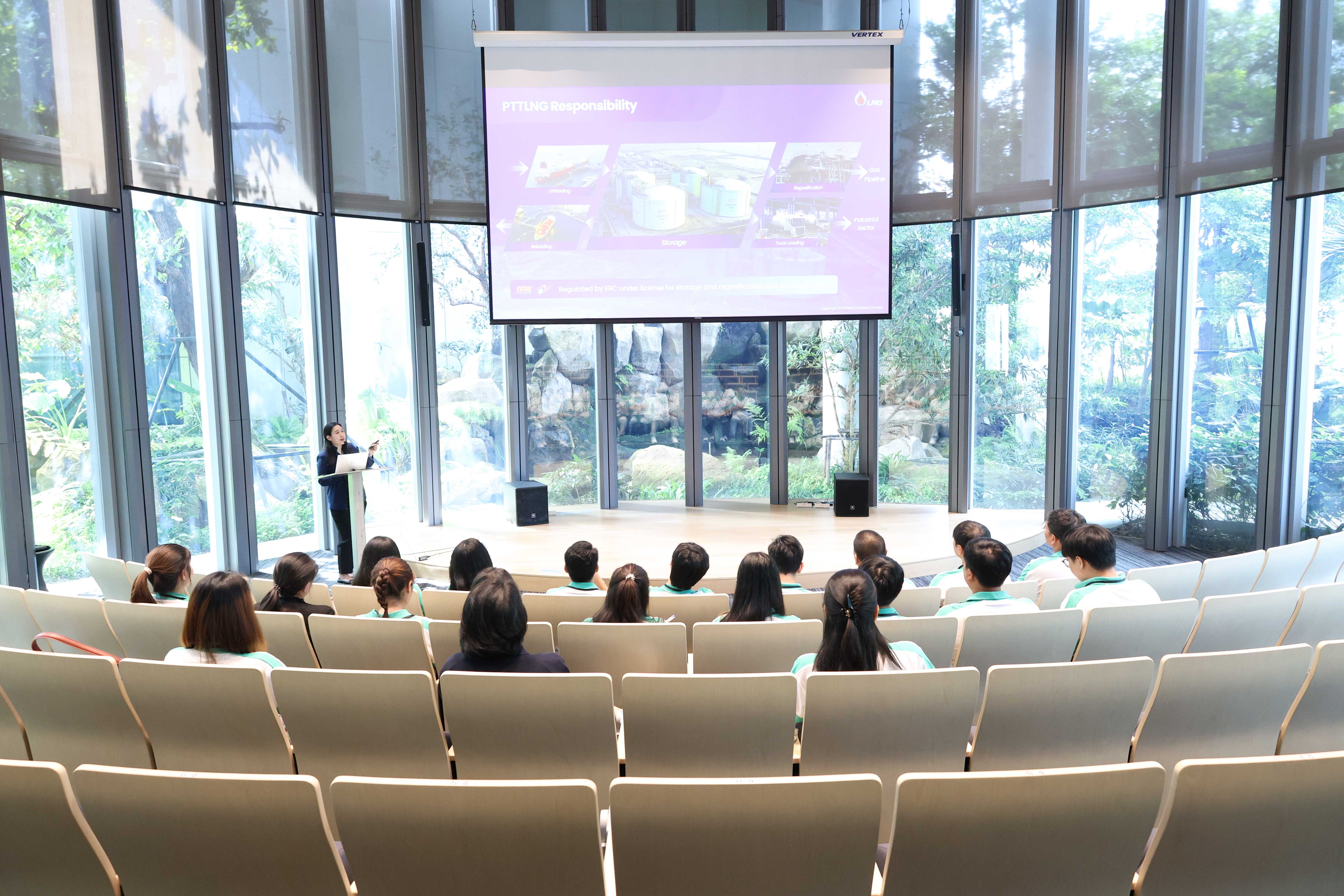 วันที่ 18 สิงหาคม พ.ศ. 2568 PTTLNG ให้การต้อนรับคณะนักเรียน Thai Kao Techno School-TTS (โรงเรียนไทยคาโอเทคโน) รุ่นที่ 12 ของบริษัท คาโอ อินดัสเตรียล (ประเทศไทย) จำกัด ในโอกาสเข้าเยี่ยมชม PTTLNG และศึกษาดูงานการดำเนินธุรกิจของบริษัทฯ เพื่อให้เกิดความรู้ ความเข้าใจ ที่มาและการดำเนินด้านนวัตกรรมการนำพลังงานความเย็นจาก LNG ที่เหลือใช้มาพัฒนาให้เกิดประโยชน์สูงสุด รวมถึงระบบการจัดการพลังงานควบคู่กับการอนุรักษ์สิ่งแวดล้อมได้อย่างยั่งยืน โดยคณะฯได้รับฟังการบรรยายสรุป “ภาพรวมการดำเนินธุรกิจ PTTLNG” โดย คุณวรัญญู วรธงไชย พนักงานประชาสัมพันธ์ หลังจากนั้น คณะฯได้เข้าเยี่ยมชมพรรณไม้เมืองหนาวภายในอาคารนิทรรศน์พรรณพฤกษา ซึ่งใช้พลังงานความเย็นที่เหลือจากกระบวนการแปรสภาพก๊าซธรรมชาติเหลว (LNG) ในการควบคุมอุณหภูมิที่ 15 องศาเซลเซียส