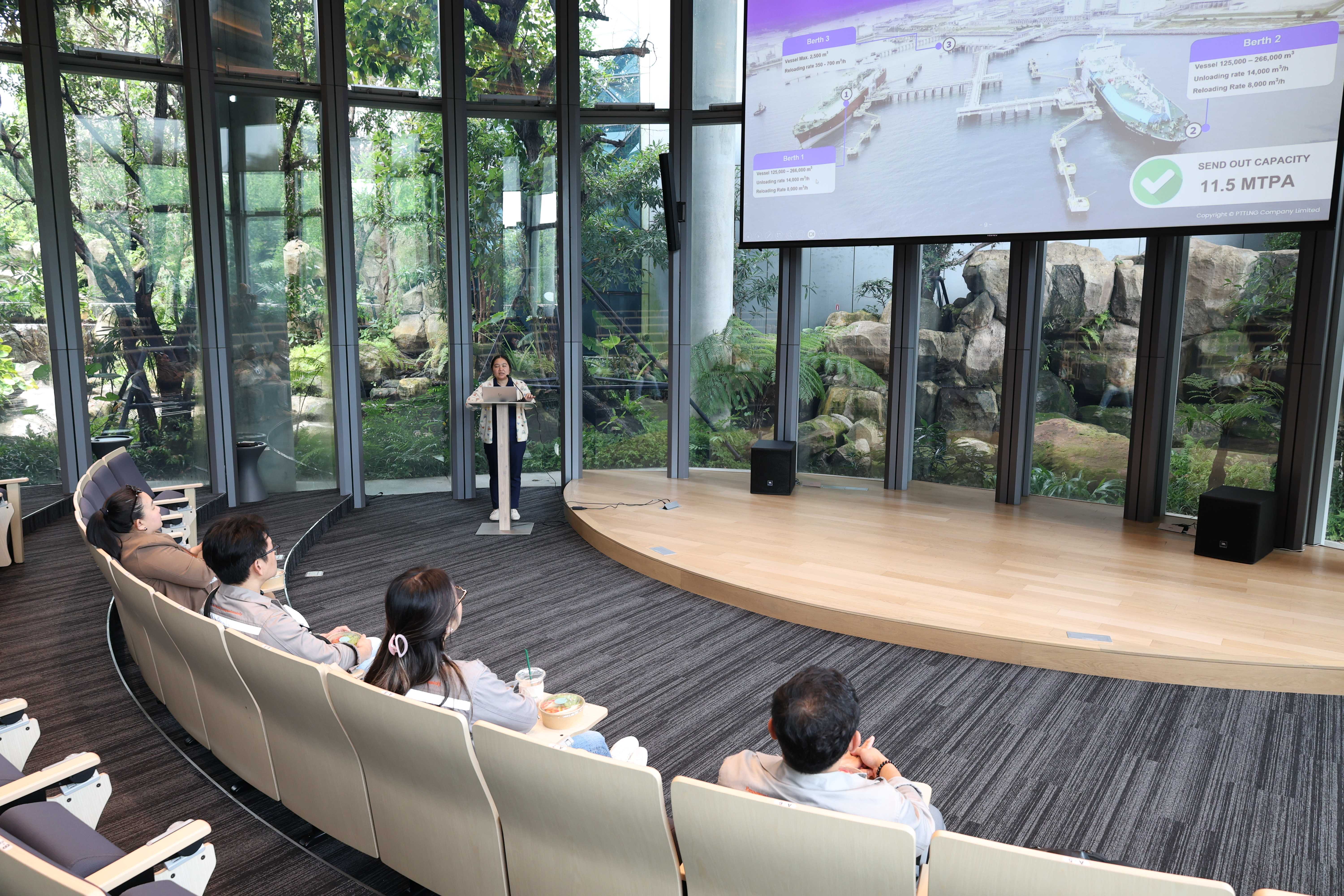วันที่ 12 กันยายน พ.ศ. 2568 PTTLNG ให้การต้อนรับคณะผู้บริหารและพนักงานบริษัท บี.กริม แอลเอ็นจี จำกัด เนื่องในโอกาสเยี่ยมชม PTTLNG เพื่อศึกษาดูงานการดำเนินธุรกิจของบริษัทฯ และให้เกิดความรู้ ความเข้าใจ ที่มาและการดำเนินด้านนวัตกรรมการนำพลังงานความเย็นจาก LNG ที่เหลือใช้มาพัฒนาให้เกิดประโยชน์สูงสุด และการบริหารจัดการด้านความปลอดภัย อาชีวอนามัย และสิ่งแวดล้อม รวมถึงระบบการจัดการพลังงานควบคู่กับการอนุรักษ์สิ่งแวดล้อมได้อย่างยั่งยืน โดยคณะฯได้รับฟังการบรรยายสรุป “ภาพรวมการดำเนินธุรกิจ PTTLNG” โดย คุณศิริวรรณ กันธิยะ พนักงานพาณิชยกิจอาวุโส พร้อมกันนี้ คณะฯได้เข้าเยี่ยมชมพรรณไม้เมืองหนาวภายในอาคารนิทรรศน์พรรณพฤกษา ซึ่งใช้พลังงานความเย็นที่เหลือจากกระบวนการแปรสภาพก๊าซธรรมชาติเหลว (LNG) ในการควบคุมอุณหภูมิที่ 15 องศาเซลเซียส