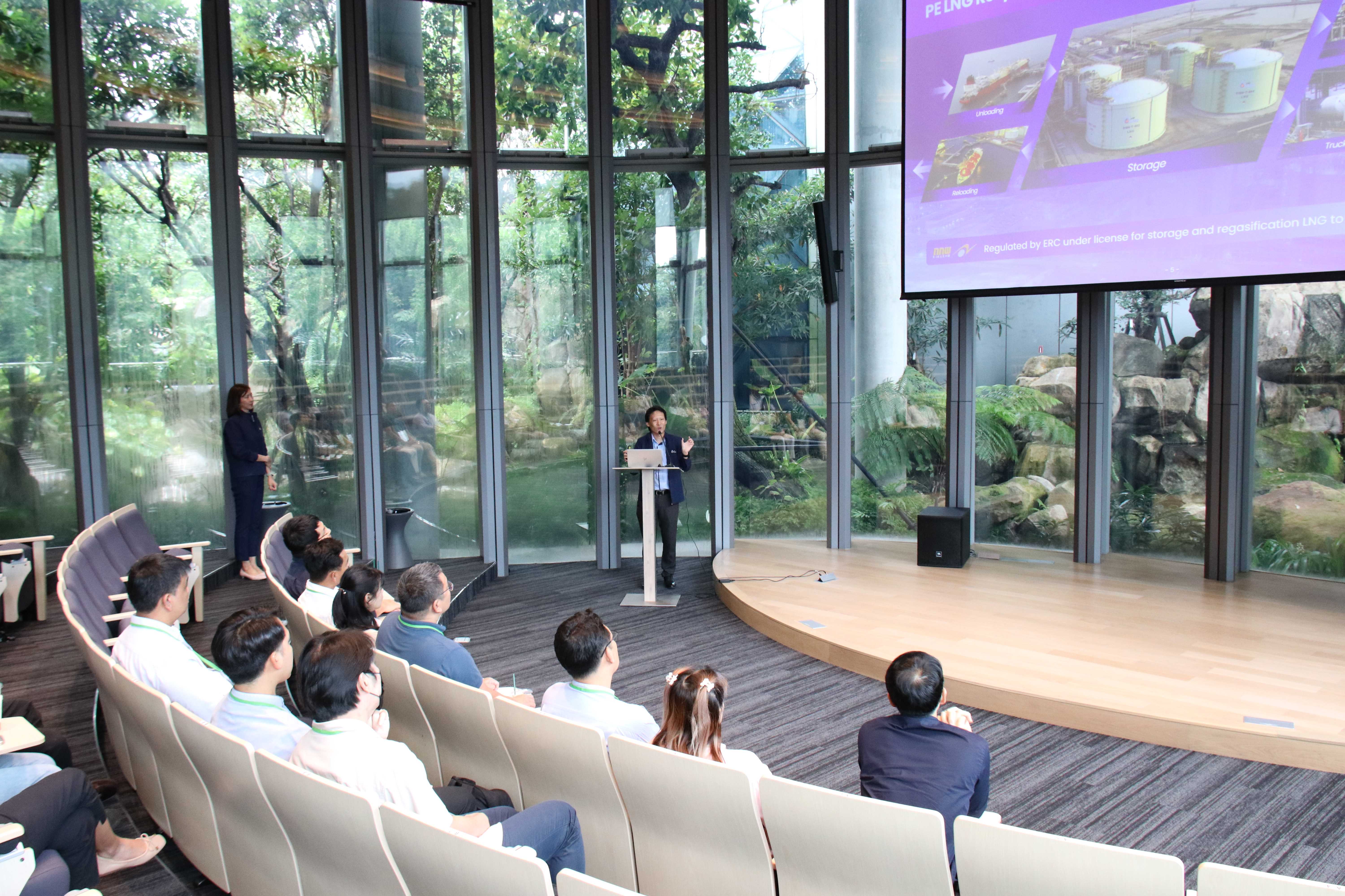 วันที่ 17 กันยายน พ.ศ. 2568 PTTLNG ให้การต้อนรับคณะผู้บริหาร ผู้ปฏิบัติงาน และพันธมิตรทางธุรกิจของการไฟฟ้าฝ่ายผลิตแห่งประเทศไทย (กฟผ.) เนื่องในโอกาสเยี่ยมชม PTTLNG เพื่อศึกษาดูงานการดำเนินธุรกิจของบริษัทฯ และให้เกิดความรู้ ความเข้าใจ ที่มาและการดำเนินด้านนวัตกรรมการนำพลังงานความเย็นจาก LNG ที่เหลือใช้มาพัฒนาให้เกิดประโยชน์สูงสุด รวมถึงระบบการจัดการพลังงานควบคู่กับการอนุรักษ์สิ่งแวดล้อมได้อย่างยั่งยืน โดยคณะฯได้รับฟังการบรรยายสรุป “ภาพรวมการดำเนินธุรกิจ PTTLNG” โดย คุณกิติภูมิ ตั้งวงษ์พิมุข ผู้จัดการส่วนสื่อสารองค์กรและกิจการเพื่อสังคม พร้อมกันนี้ คณะฯได้เข้าเยี่ยมชมศูนย์ควบคุมการปฏิบัติการส่วนกลาง (Central Control Room) ซึ่งเป็นหัวใจสำคัญของระบบปฏิบัติการ พร้อมทั้งเข้าเยี่ยมชมพรรณไม้เมืองหนาวภายในอาคารนิทรรศน์พรรณพฤกษา ซึ่งใช้พลังงานความเย็นที่เหลือจากกระบวนการแปรสภาพก๊าซธรรมชาติเหลว (LNG) ในการควบคุมอุณหภูมิที่ 15 องศาเซลเซียส ถือเป็นหนึ่งในตัวอย่างนวัตกรรมการใช้พลังงานอย่างมีประสิทธิภาพและยั่งยืน