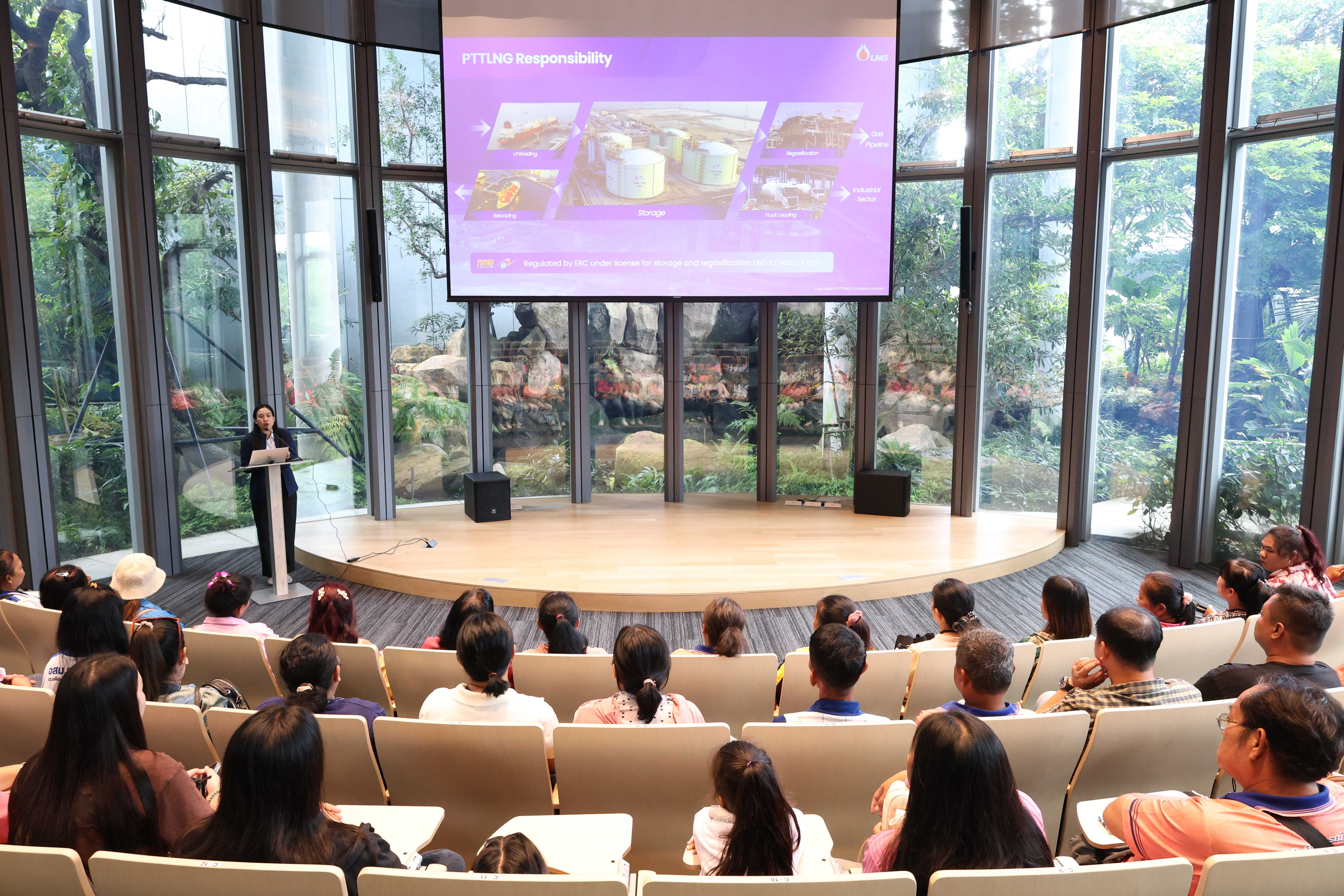 วันที่ 20 ตุลาคม พ.ศ. 2568 PTTLNG ให้การต้อนรับคณะเจ้าหน้าที่และอาสาสมัครสาธารณสุขประจำหมู่บ้าน โรงพยาบาลส่งเสริมสุขภาพตำบลท่าฤทธิ์ ตำบลวังม่วง อำเภอวังม่วง จังหวัดสระบุรี ในโอกาสเยี่ยมชม PTTLNG เพื่อศึกษาดูงานการดำเนินธุรกิจของบริษัทฯ และให้เกิดความรู้ ความเข้าใจ ด้านการบริหารจัดการงานรับ-จ่ายก๊าซธรรมชาติเหลว ที่มาและการดำเนินด้านนวัตกรรมการนำพลังงานความเย็นจาก LNG ที่เหลือใช้มาพัฒนาให้เกิดประโยชน์สูงสุด รวมถึงการดำเนินงานตามภารกิจโดยคำนึงถึงการมีส่วนรับผิดชอบต่อชุมชนและสังคมอย่างยั่งยืน โดยคณะฯได้รับฟังการบรรยายสรุป “ภาพรวมการดำเนินธุรกิจ PTTLNG” โดย คุณวรัญญู วรธงไชย พนักงานประชาสัมพันธ์ หลังจากนั้น คณะฯได้เข้าเยี่ยมชมพรรณไม้เมืองหนาวภายในอาคารนิทรรศน์พรรณพฤกษา ซึ่งใช้พลังงานความเย็นที่เหลือจากกระบวนการแปรสภาพก๊าซธรรมชาติเหลว (LNG) ในการควบคุมอุณหภูมิที่ 15 องศาเซลเซียส